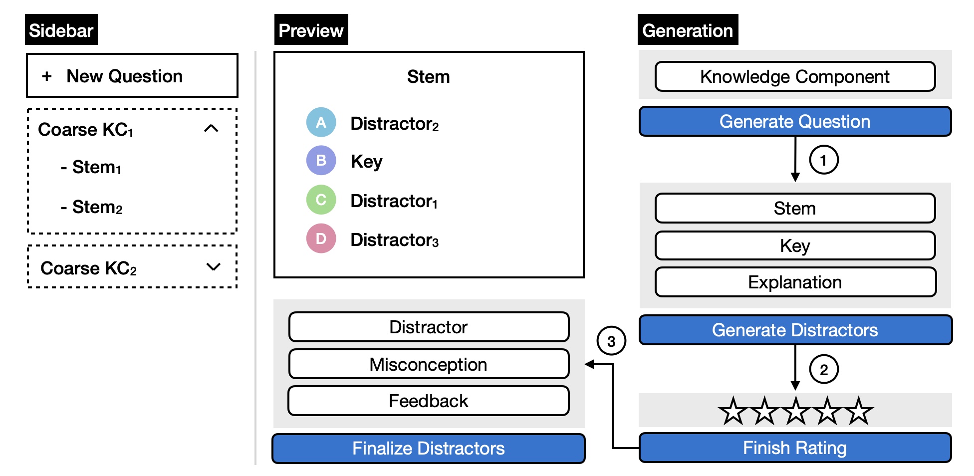 The educator generates MCQs using the Generation component as discussed in Section 2.1. Here, after prompting LLMs using the edited stem, key, and explanation, we add a rating step to assess the overall quality of misconceptions, distractors, and feedback that the educator rates based on a 5-point Likert scale.