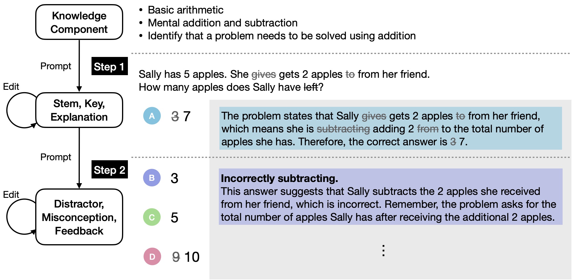 Now, we explore a scenario where an educator creates MCQs using our tool based on the concept of basic arithmetic, specifically focusing on mental addition. In the first step, given the target KC, along with an in-context example consisting of the concept, stem, key, and explanation, the LLM generates the following stem: “Sally has 5 apples. She gives 2 apples to her friend. How many apples does Sally have left?” However, this stem mistakenly embodies the KC of subtraction rather than addition. Therefore, the educator edits the generated results to align it with the intended KC of addition. In the second step, using the adjusted stem, key, and explanation, as well as incorporating in-context examples with distractors, misconceptions, and feedback, the LLM generates distractors along with corresponding misconceptions and feedback. Figure 1 illustrates option \(B\), which contains a misconception related to subtraction instead of addition, accompanied by feedback designed to correct this error. Additionally, the educator has the option to edit option \(D\) to address any misconceptions associated with multiplication.