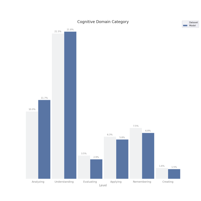 We present an overview of the results in Table 4. Further analysis of the generated questions indicates that the models finetuned on EduQuest are able to faithfully replicate the cognitive skills accessed by real-life exams and problem sets according to both dimensions of the revised bloom’s taxonomy hierarchy. In particular, this implies that questions that require higher order cognitive skills, like metacognitive questions, for example, are generated easily using EduQuest.