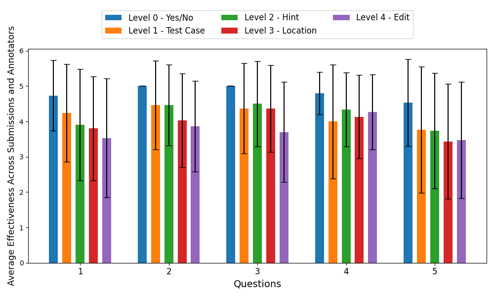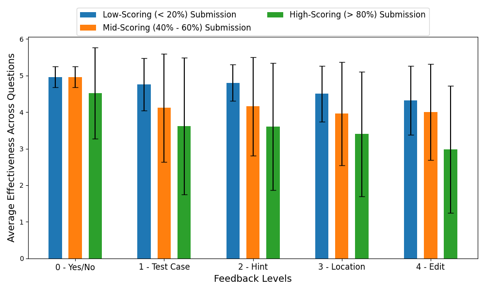 In our paper, GPT-4’s ability to generate feedback-ladders for programming assignments is examined. While promising, our user study revealed limitations in providing highly effective feedback, especially at advanced levels. However, the method remains valuable for teachers to tailor feedback to student proficiency levels, reducing workload by addressing mistakes in low-scoring submissions. Future research could include large-scale classroom studies for real-time interventions, personalized feedback models, making feedback personalized to each student’s knowledge [8] and dedicated LLM training for feedback generation to mitigate time and cost concerns associated with GPT-4.