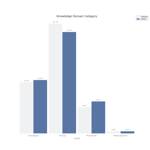 The knowledge dimension has four categories. Factual (elementary knowledge) conceptual (principles, theories and models) procedural (algorithmic or technical) metacognitive (knowledge of cognition). This labeling was done using GPT 3.5 (Appendix B).