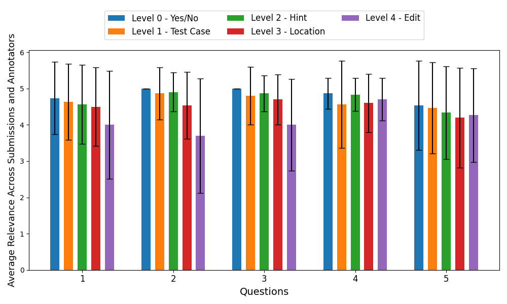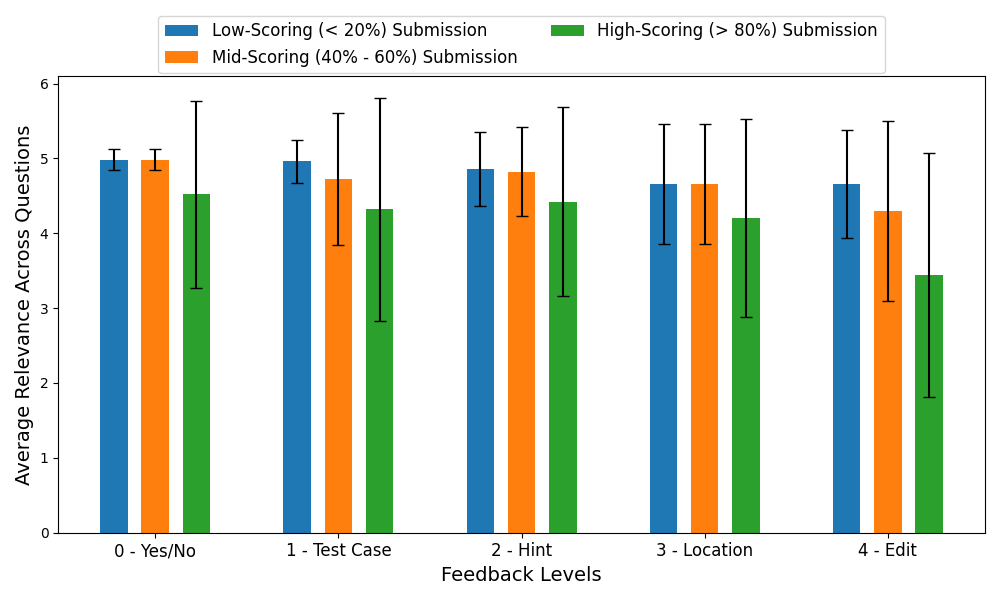 In our paper, GPT-4’s ability to generate feedback-ladders for programming assignments is examined. While promising, our user study revealed limitations in providing highly effective feedback, especially at advanced levels. However, the method remains valuable for teachers to tailor feedback to student proficiency levels, reducing workload by addressing mistakes in low-scoring submissions. Future research could include large-scale classroom studies for real-time interventions, personalized feedback models, making feedback personalized to each student’s knowledge [8] and dedicated LLM training for feedback generation to mitigate time and cost concerns associated with GPT-4.