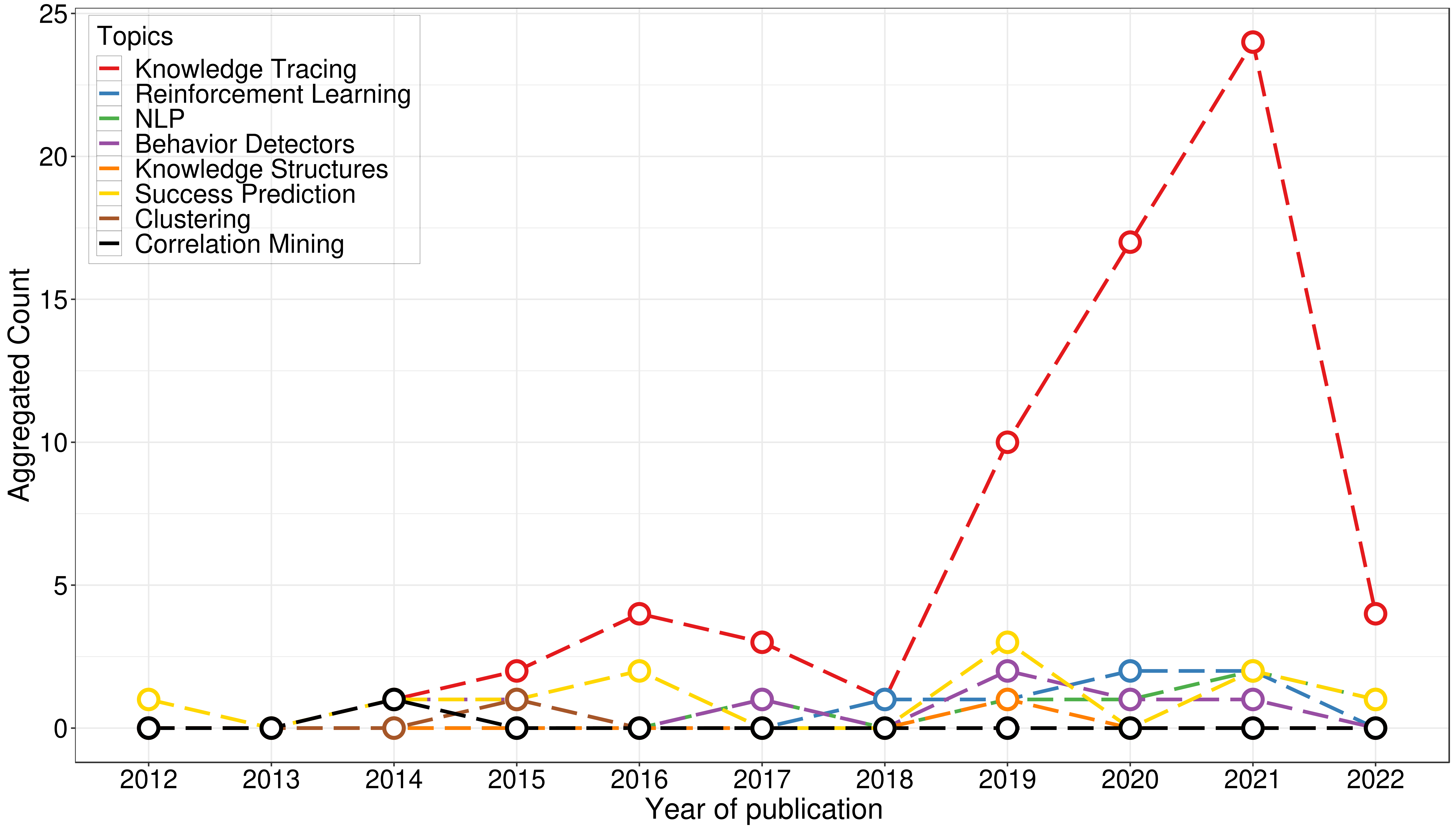Figure 2 shows that Knowledge Tracing (KT) has seen a major rise from the year 2018 with n = 1 to peaking in 2021 with n = 24. Reinforcement learning and NLP have seen a gradual increase across years, whereas success prediction and behavior detectors have had consistent popularity throughout.