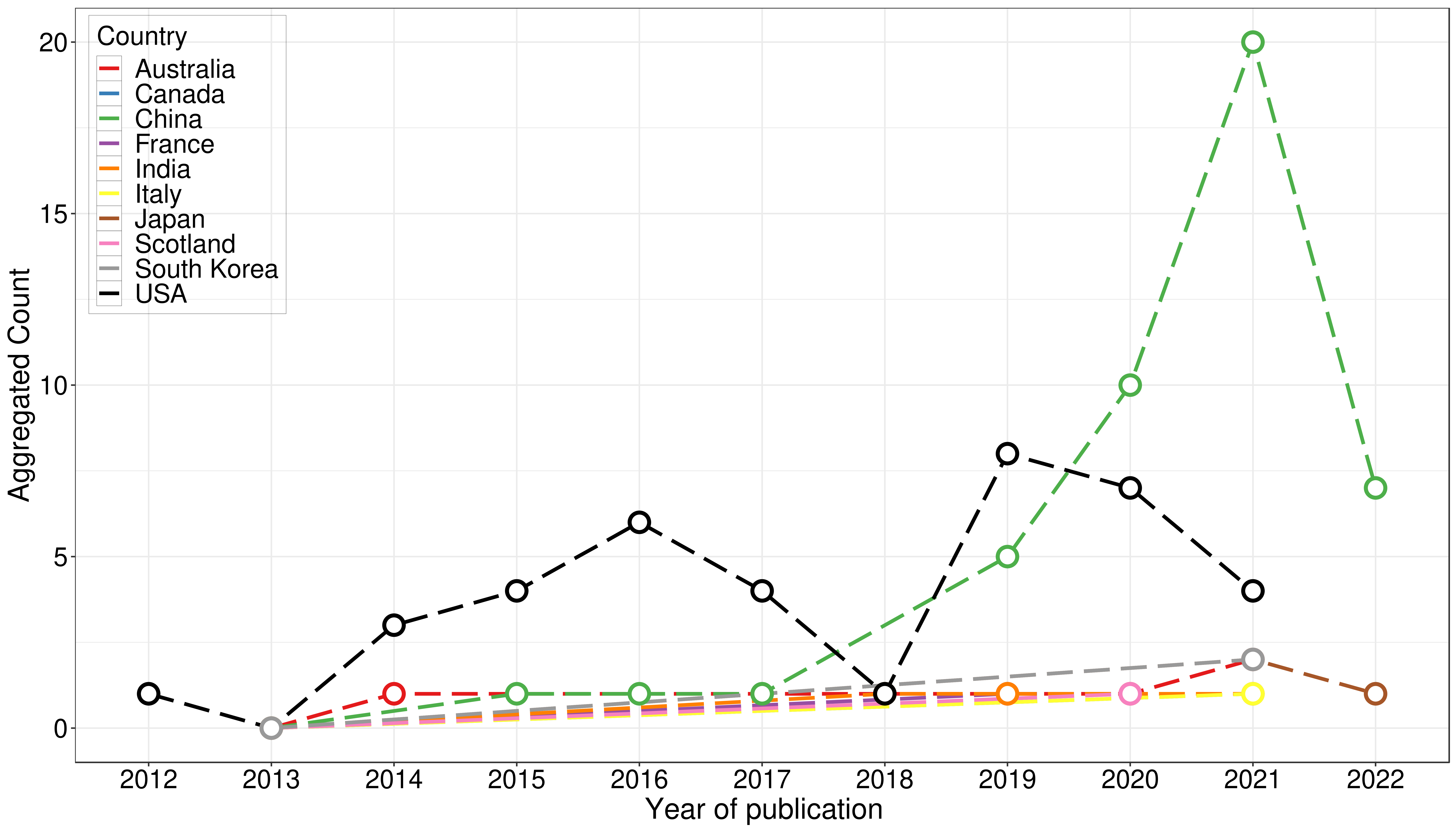 Changes over time are shown in Figure 4. The USA held a leading position in the publication of SDA studies until 2020 when China surpassed it. In the year 2021, China saw a marked increase in its publication count of SDA studies from n=10 to n=20, whereas the USA experienced a downturn from n=7 to n=4.