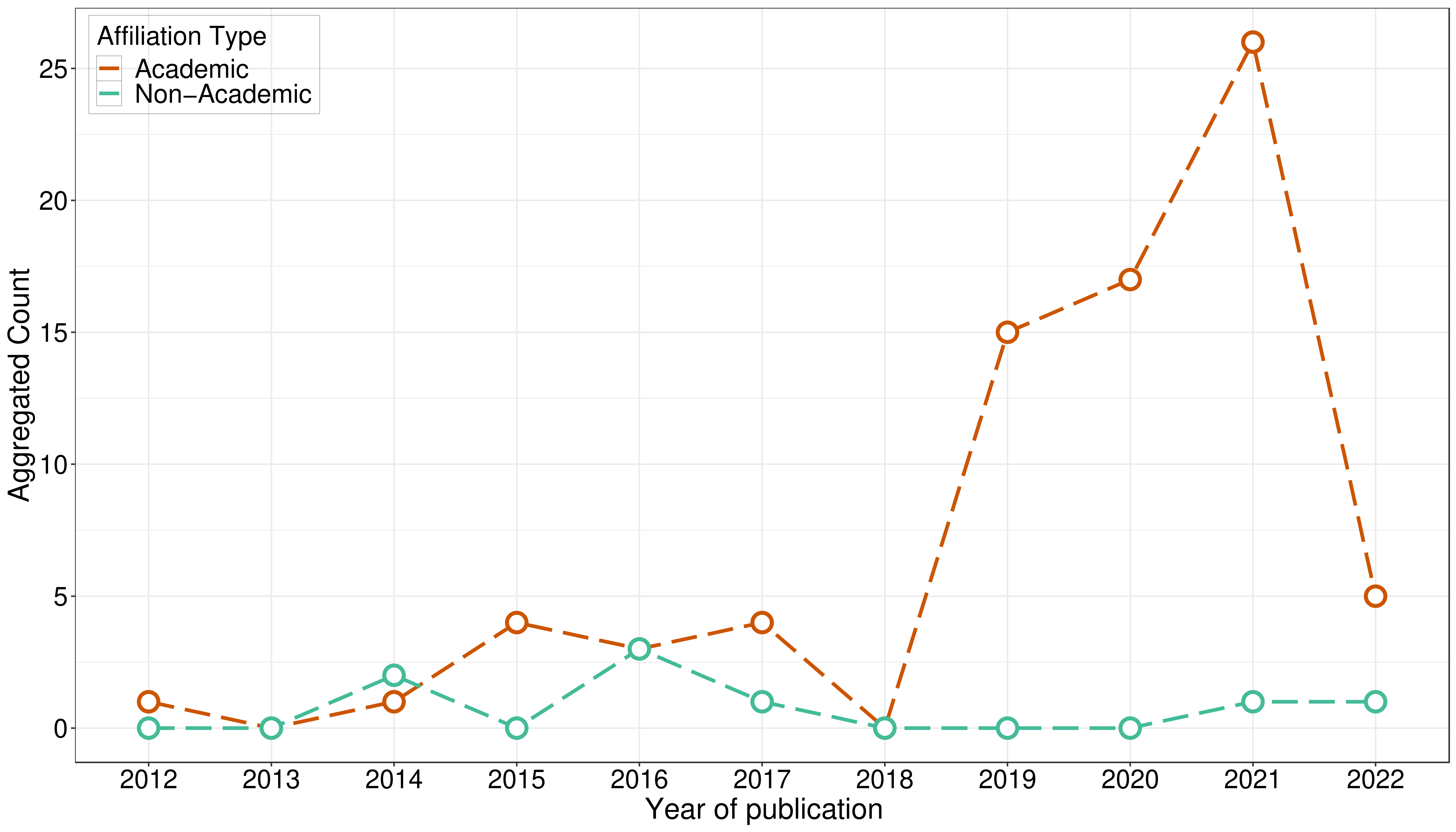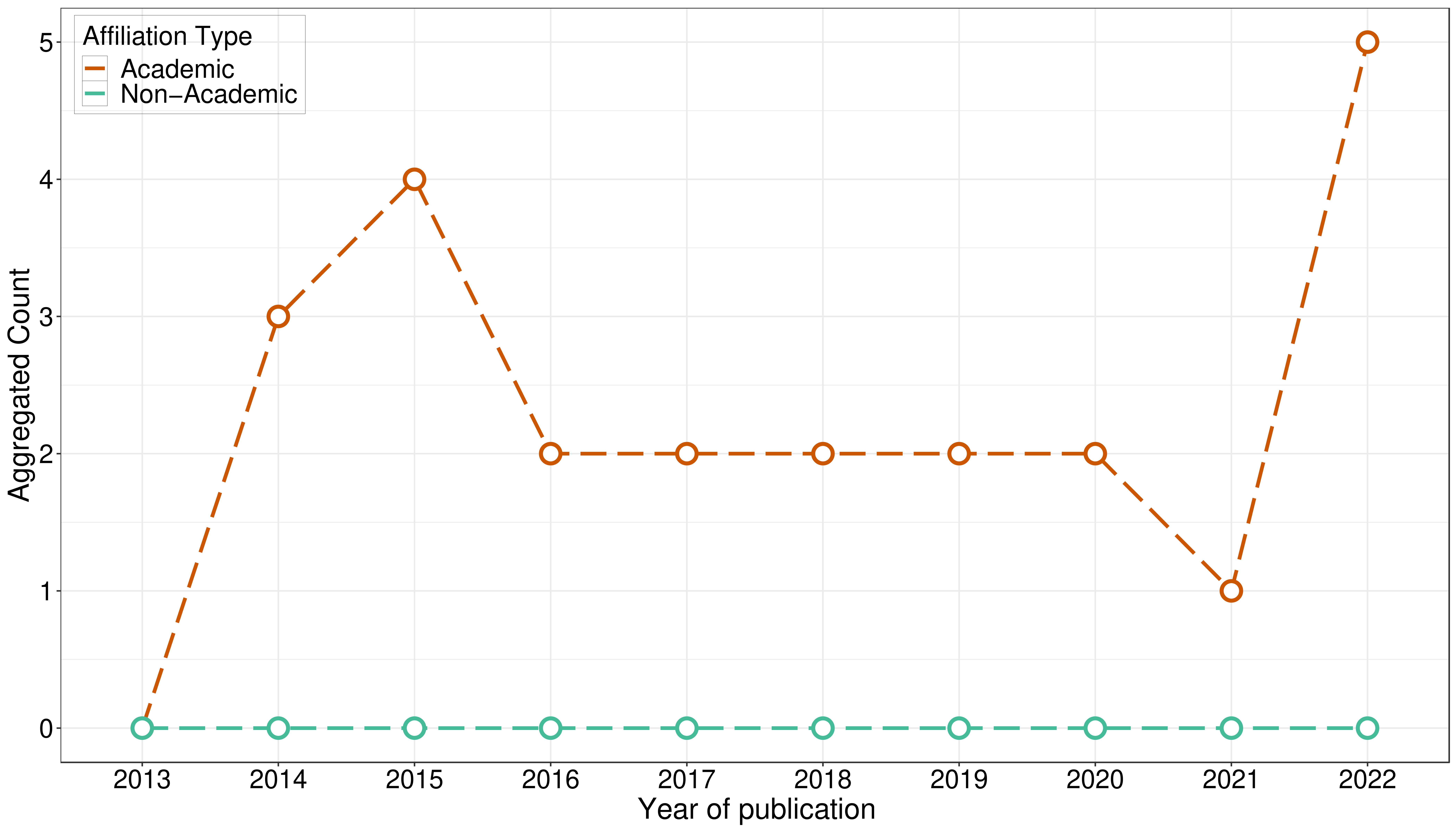 Conversely, the frequency of A/B studies conducted by academic affiliations shows an overall pattern of decrease from 2015 to 2021, with a rise only from 2021 to 2022, and with no A/B studies