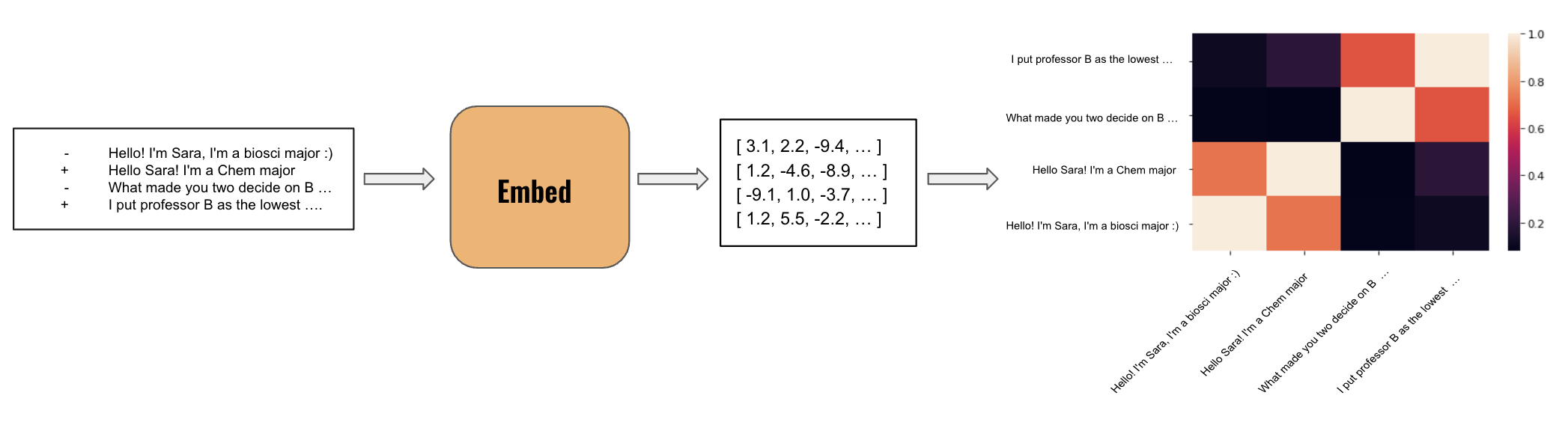 For semantic similarity extraction, we utilize the MPNet pre-trained model [Song et al., 2020], renowned for its superior performance in sentence-level semantic tasks. Trained on datasets comprising pairs of semantically similar or dissimilar sentences, MPNet excels in identifying linguistic features indicative of semantic similarity. This model encodes sentences into a semantic space, where the vector representation of each sentence encapsulates its semantic content. Through this process, MPNet effectively maps sentences to vectors in a high-dimensional space, tuned to capture semantic nuances accurately [Song et al., 2020]. To aggregate individual sentence similarities into a cohesive group measure, we construct a semantic similarity matrix from the conversation messages, analogous to a covariance matrix. In a conversation with \(n\) messages, an \(n \times n\) matrix \(R\) is formulated, where each element \(R_{i,j}\) represents the semantic similarity between the \(i^{th}\) and the \(j^{th}\) messages. This matrix not only quantifies overall group cohesion but also facilitates the temporal visualization of cohesion within the group. A visual overview of this process is shown in 1.