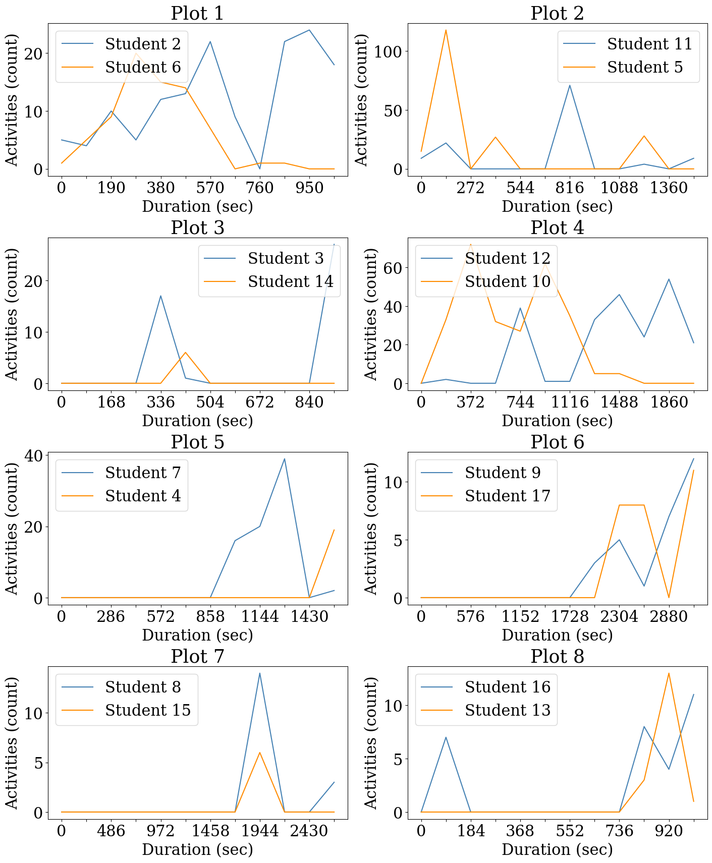 Some students maintained a steady pace of interaction throughout their session, as seen in the activity lines of Students 12 and 10 in Figure 2(b) Plot 4, which could imply a consistent and sustained collaborative effort. Conversely, the interaction patterns of Students 8 and 15 in Figure 2(b) Plot 7 were characterized by sharp peaks and troughs, hinting at intermittent collaboration or independent work followed by joint discussions.