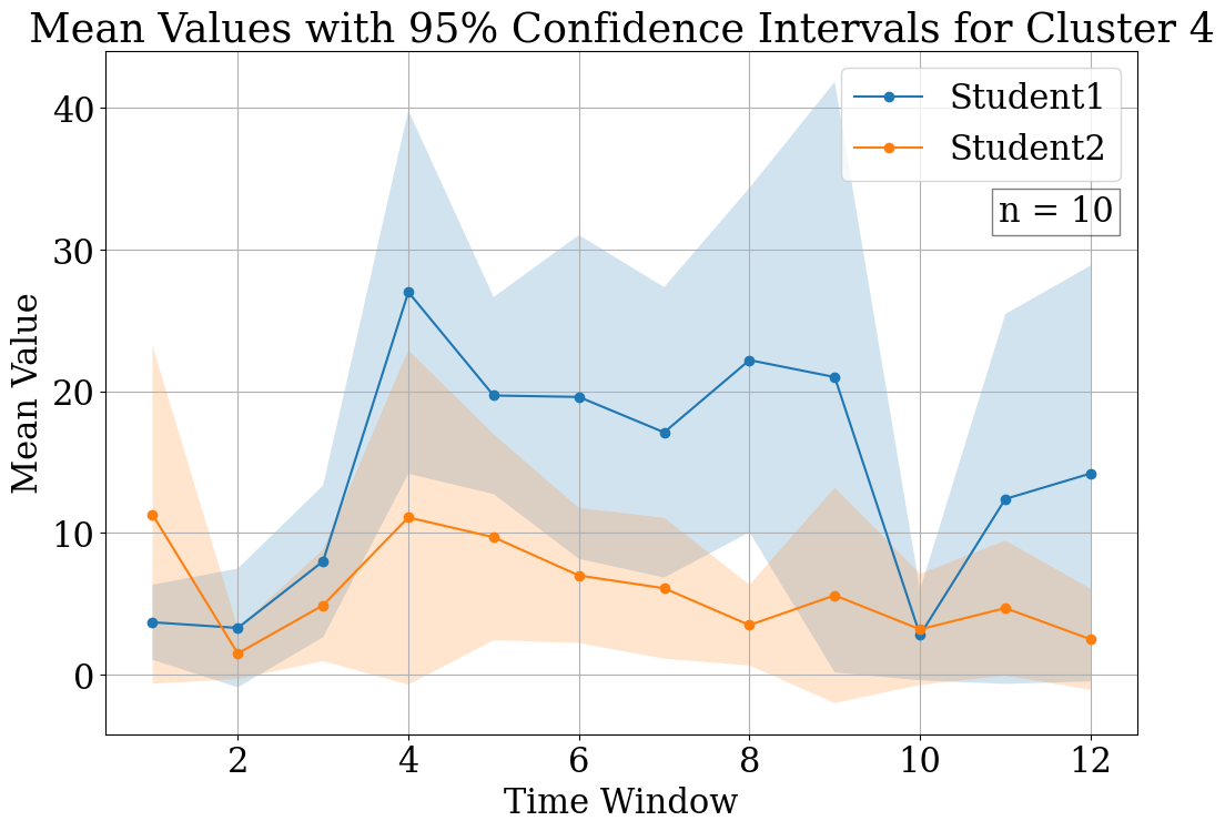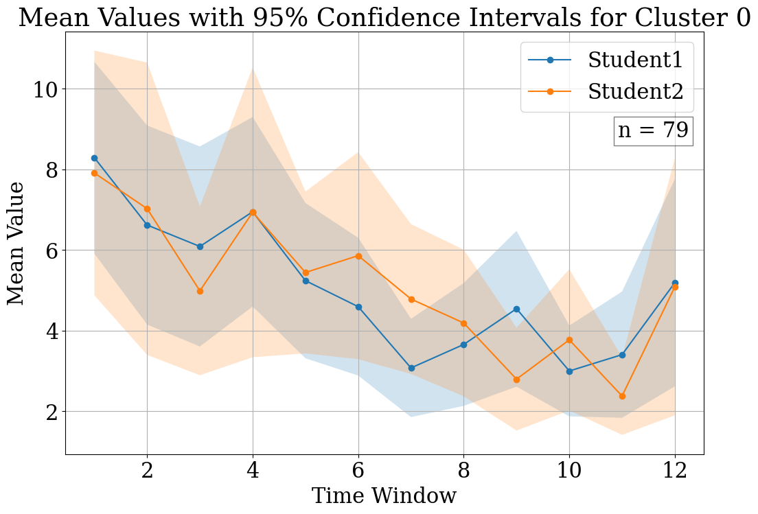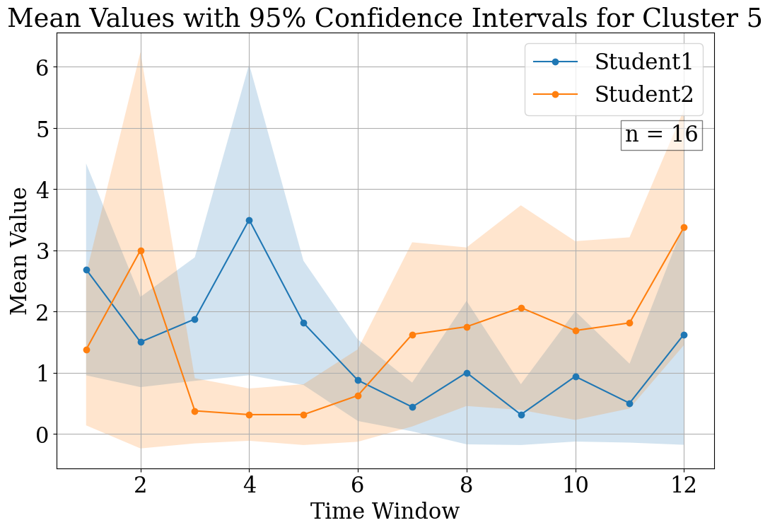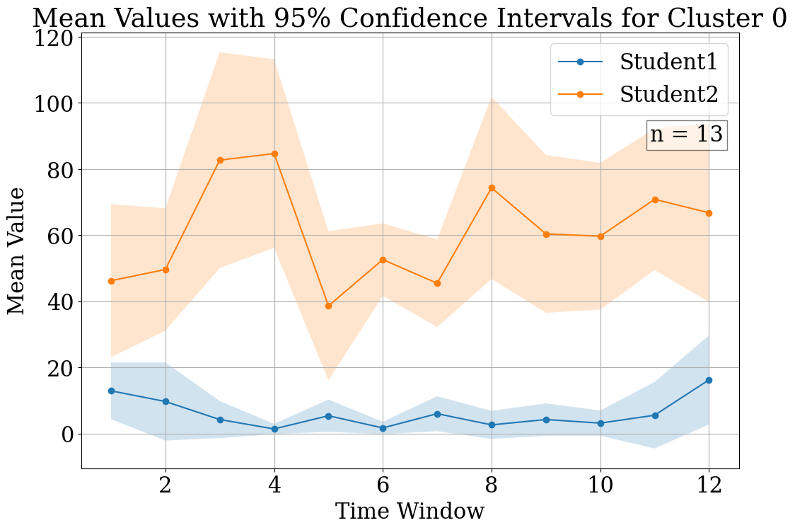 In the first duration group, Figure 3(a) represents the first cluster, revealing a delayed peak in student activity, indicating a gradual build-up to collaboration. Conversely, Figure 3(b) illustrates an early peak, suggesting a swift engagement from the outset. For the second duration group depict an interaction crossover between students and a dominance by Student1, respectively. In Figure 3(c), Student1 starts with less activity, which increases over time, while Student2’s activity decreases, hinting at a collaborative mode where roles evolve throughout the session. Figure 3(d) shows Student1’s clear predominance in activity levels, suggesting a leading role in the collaborative process. The third group’s cluster plots present contrasting interaction patterns. Figure 3(e) shows closely aligned CI between students, implying synchronous collaboration. In contrast, Figure 3(f) shows a distinct separation between the students’ CI, with Student1 taking a less active role, suggesting an asymmetric collaborative dynamic in which one student predominantly leads the interaction. Finally, in the fourth duration group, Figures 3(g) and 3(h) also reflect divergent collaborative patterns. Figure 3(g) mirrors the third group’s first cluster with overlapping CI, while Figure 3(h) displays no overlap, indicating a more independent work dynamic, with Student1 engaging significantly less than Student2.