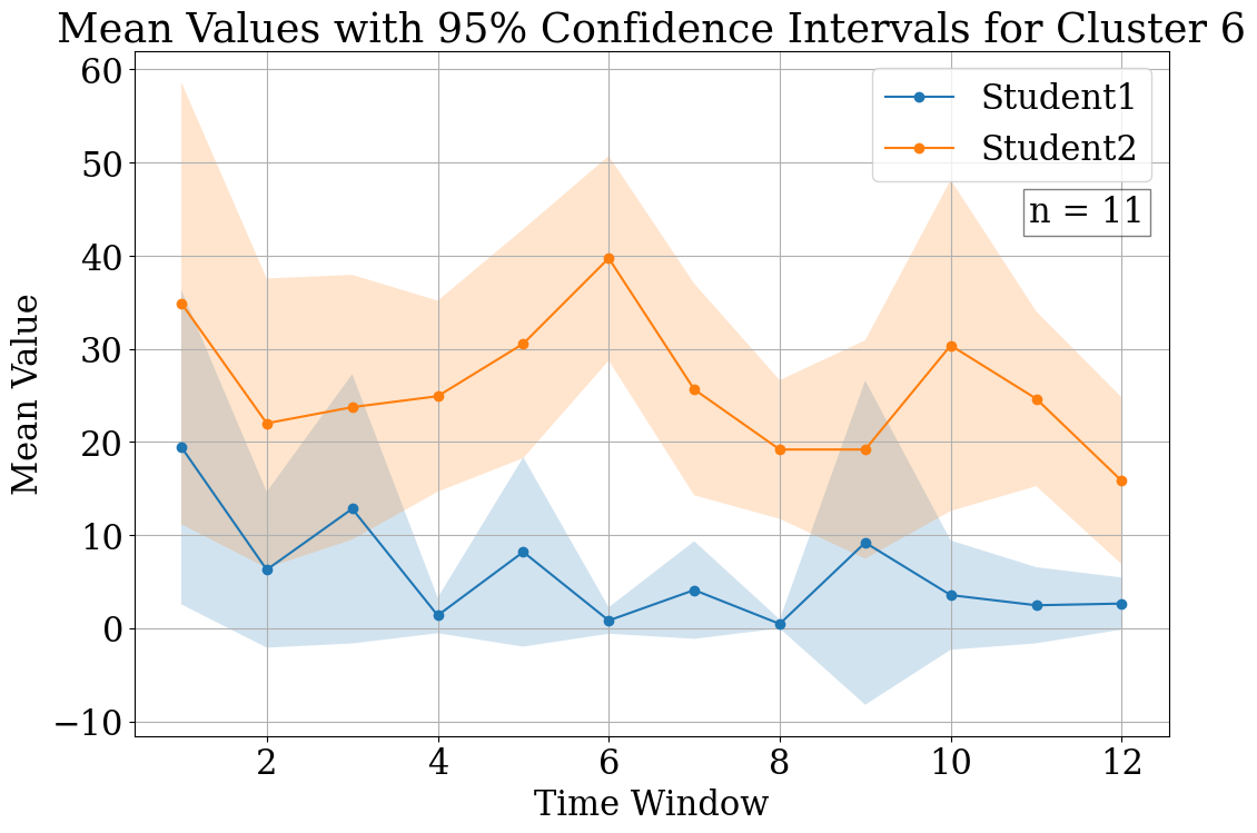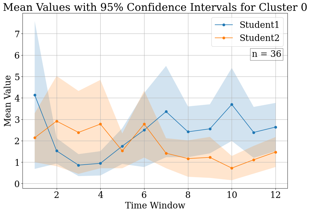 For each duration of the session, two main groups were determined and the patterns of their collaborative interactions were clarified using Confidence Interval (CI) plots as shown below in Figure 3.