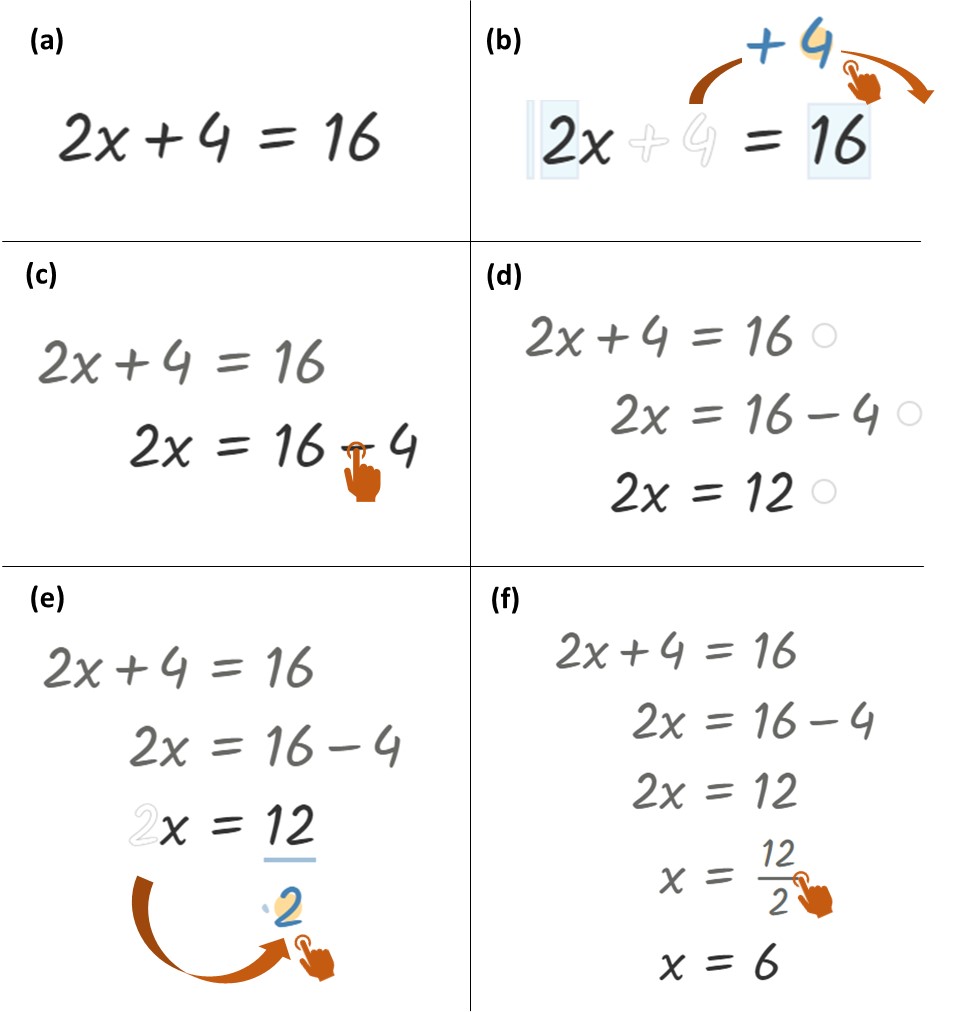 Graspable Math1 (GM; Figure 1a) is a dynamic mathematics notation tool that was developed based on theories of perceptual learning and embodied cognition to support students’ mathematics learning [38]. GM treats mathematical symbols as tactile objects, which allows students to physically interact with numbers and symbols on a digital whiteboard and manipulate them via touch or mouse-based gestures (Figure 1b). By treating mathematical notations like objects on a screen, students can solve mathematical problems (e.g., 2x+4=16 in Figure 1b-a) by moving symbols to transform expressions or equations, resulting in tangible learning experiences (Figure 1b-b through f).